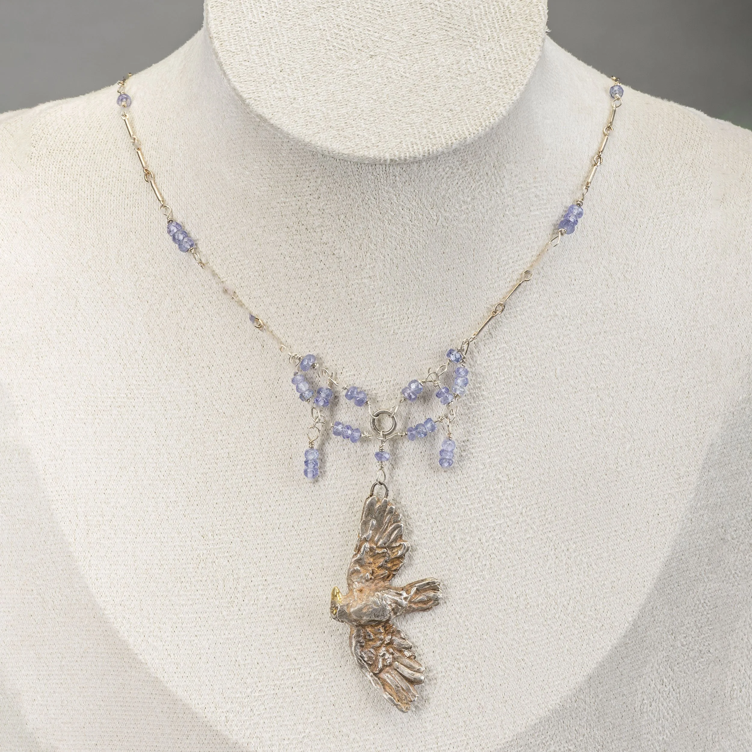 This fine silver bird is soaring. The word “fly” shines in gold foil on the wing.