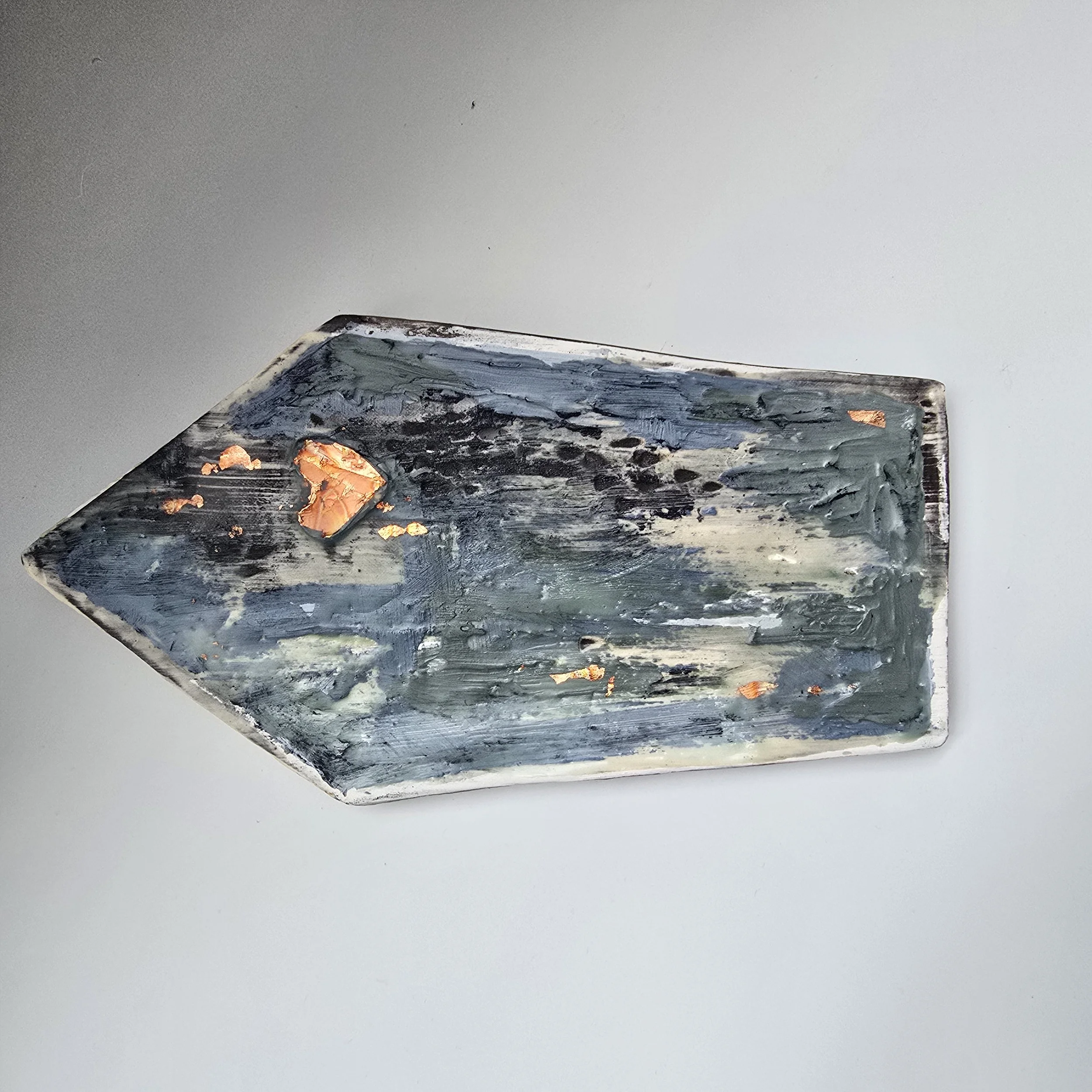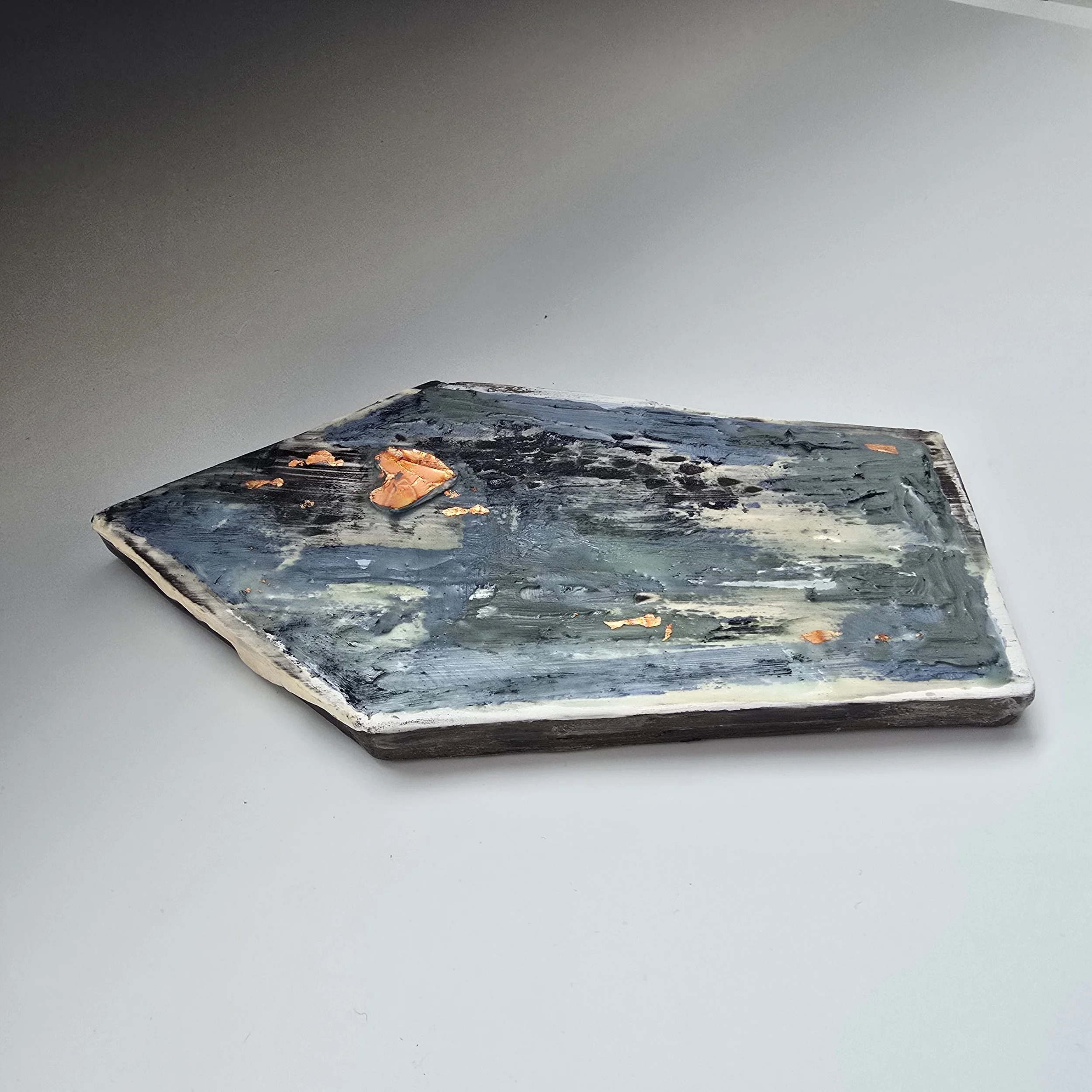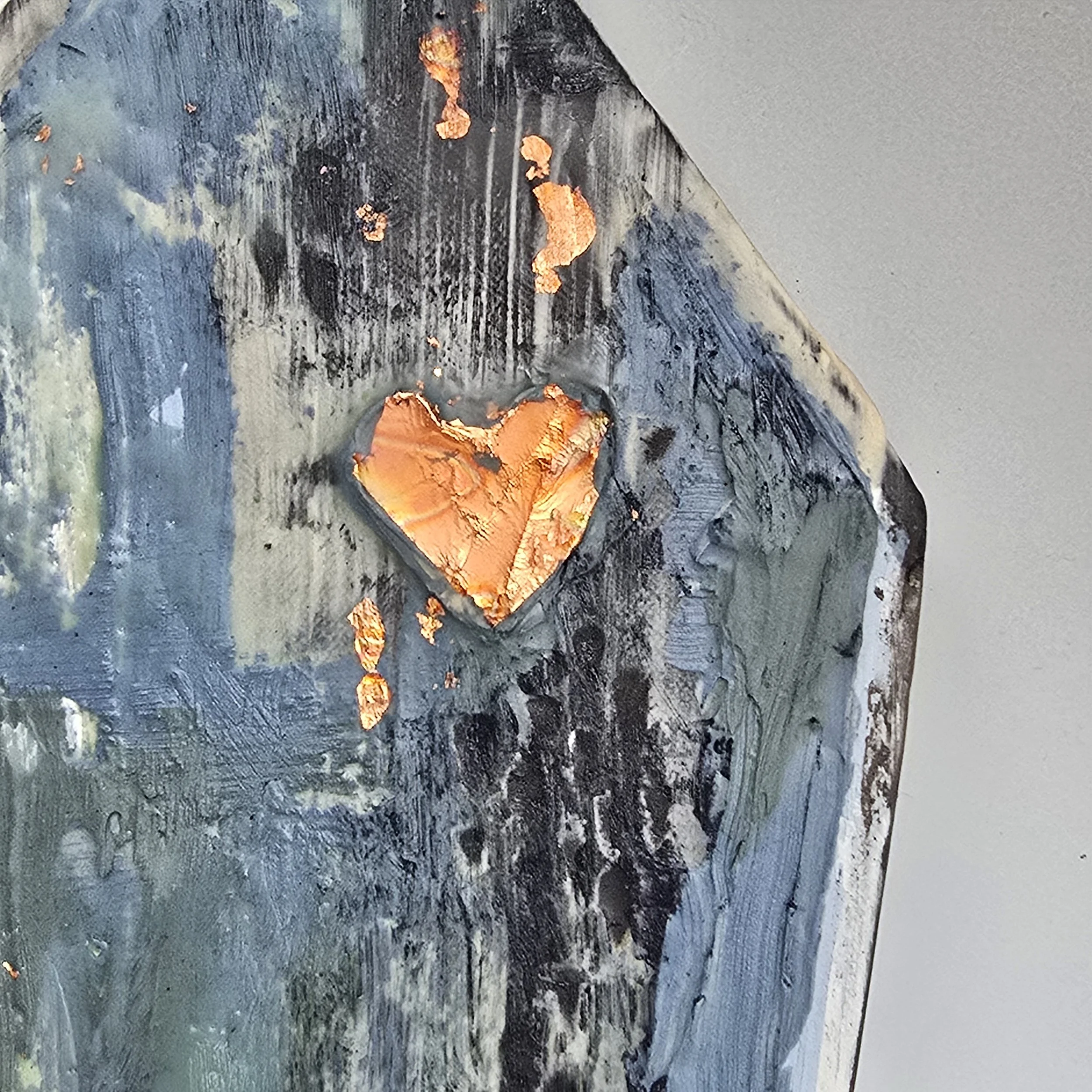 The freedom to experiment in a great thing! This is part of the house series where I went hog wild. This one is made with colored slips, copper foil and encaustic wax.